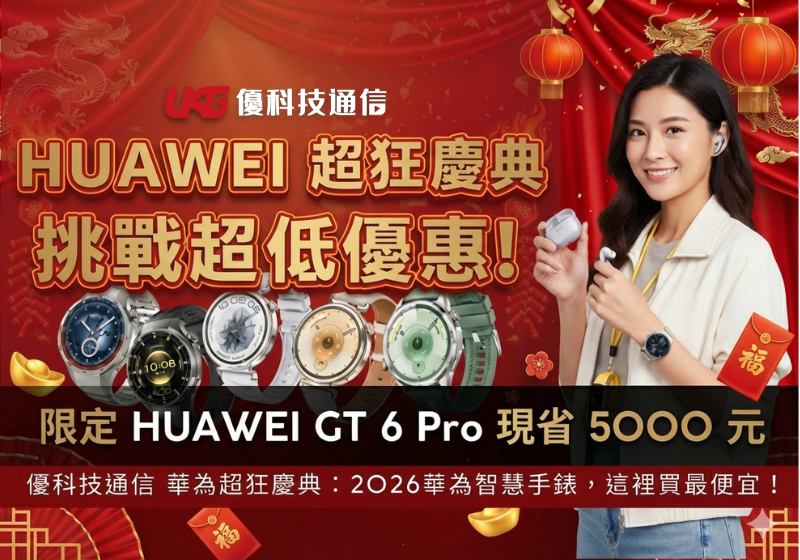沒看這篇真的會搥心肝!UKG 華為超狂慶典,智慧手錶現省 5000 元起? 這次優科技通信推出的「HUAWEI 超狂慶典」是針對穿戴裝置愛好者打造的年度最強檔期。活動主打 Huawei Watch GT6 Pro 與 GT5 Pro 頂級旗艦錶款,搭配新款降噪耳機推出「現折近 5000 元」的超殺組合,更祭出買錶送耳機(FreeBuds SE3)的超值好禮三選一。強烈建議追求極致 CP 值、或正打算升級商務運動手錶的你,絕對不能錯過這次入手的最佳時機!
