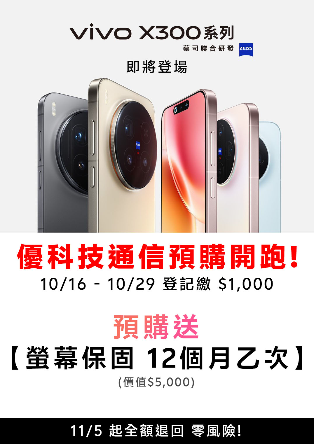 💡綜合來看:如果你重視 性能、拍攝與續航,或者想搶先體驗新機,X300 系列值得列入考慮!想搶先體驗 X300 新機魅力的朋友,記得把握 10/16~10/29 盲購登記期,只要繳交 $1000 就能卡位、享 12 個月螢幕保固,加上 11/5 起全額退回,真的是零風險又划算~