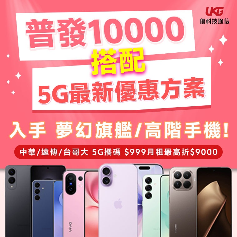 活動注意事項:本活動為「普發1萬元放大優惠」限時專案,限時攜碼優惠,最高折扣 $9,000 僅適用於搭配中華電信、遠傳電信、台灣大哥大 5G $999 以上資費方案。實際金額與促銷內容依門市報價為準;各手機於不同平台活動價可能不同,活動內容若有變動恕不另行通知,如有疑問請先來電或透過官方 LINE 洽詢。