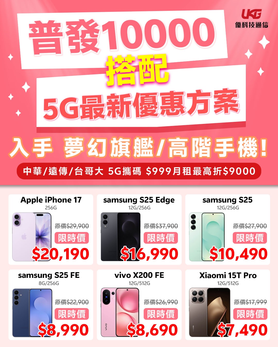 嗨~我是優編🙋♂️這次真的要幫大家「放大那1萬元」的威力啦!政府普發1萬元,你還在想要拿去買什麼嗎?現在來【優科技通信】辦理中華、遠傳、台哥大 5G 攜碼方案,不只免多花錢,甚至直接「省到一支夢幻旗艦手機」!月租只要 $999(或更高),手機最高現折 $9,000,部分機款搭配普發1萬後根本0元入手!別家通訊行折扣只能折在月租或配件,我們直接折在手機本身,價差一看就知道超划算!