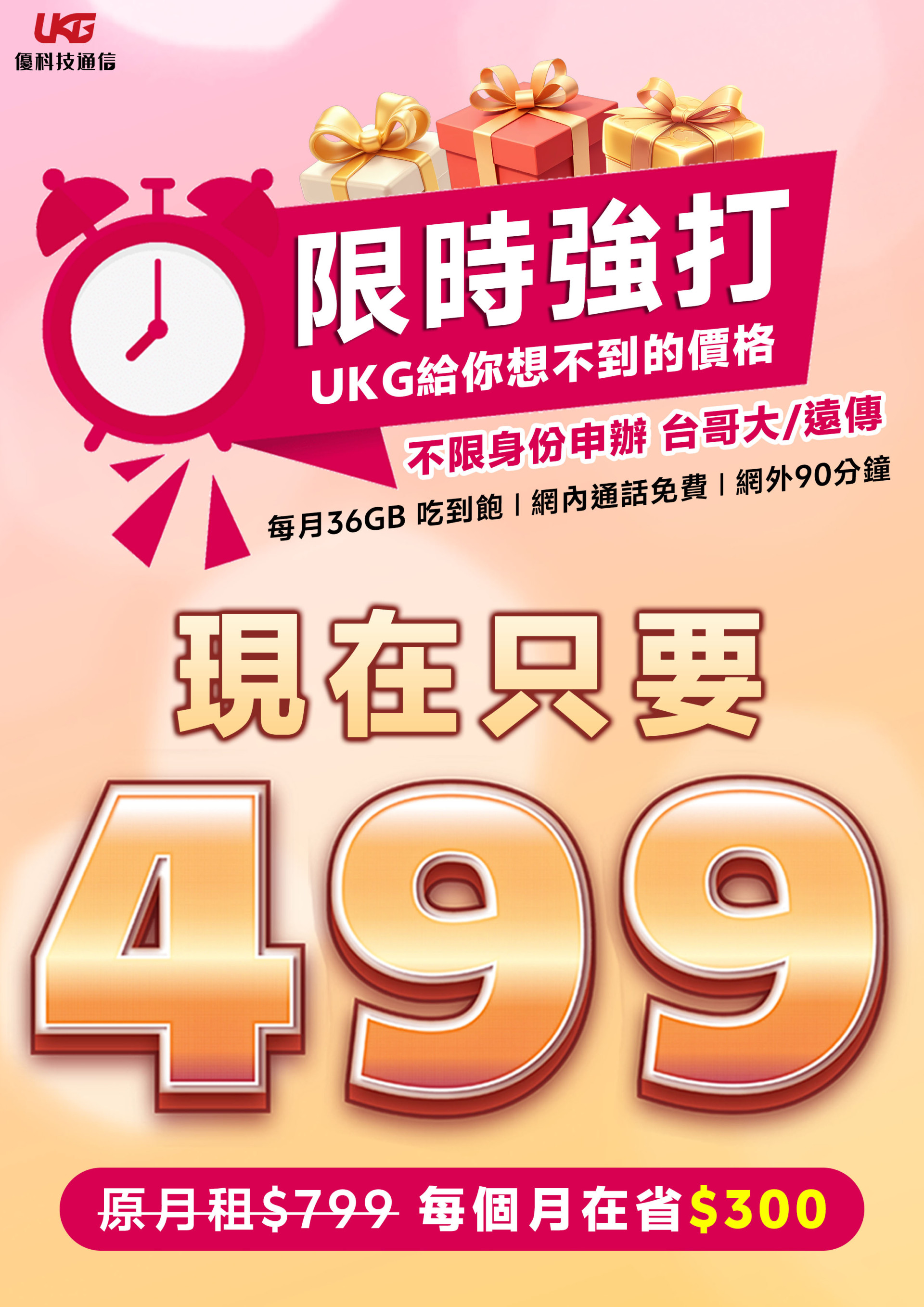 UKG 優科技通信 3 月份強勢出擊! 我們幫您把預算花在刀口上,原價 $799 的優質方案,現在限時回饋只要 $499!不限學生、不限身分,只要您想追求高 CP 值,這檔絕對是首選。