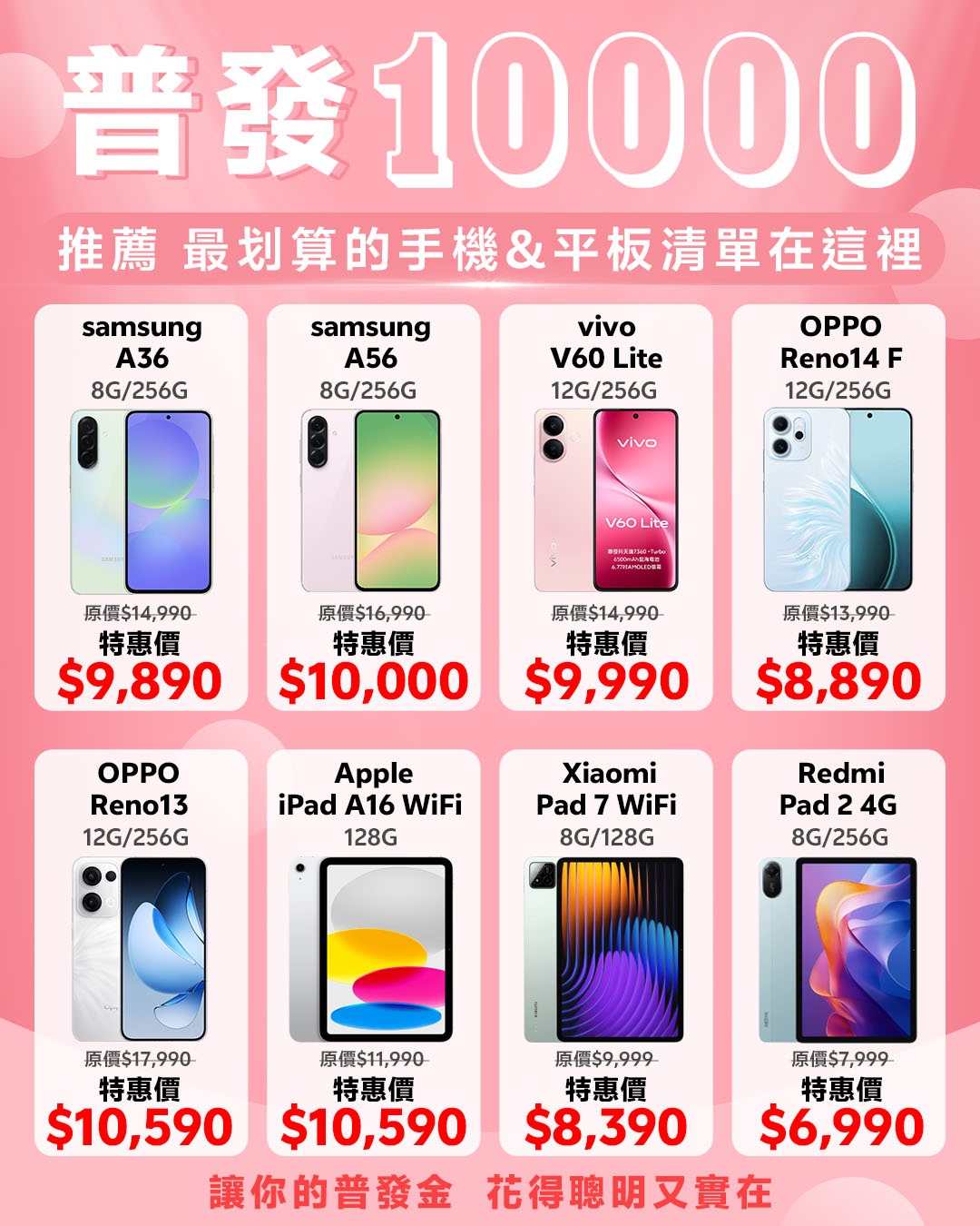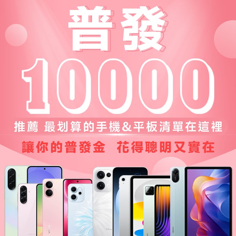 我們把優惠價放明白,讓你用「普發1萬元」就能直接買到實用手機或平板,不用再盲目比價。