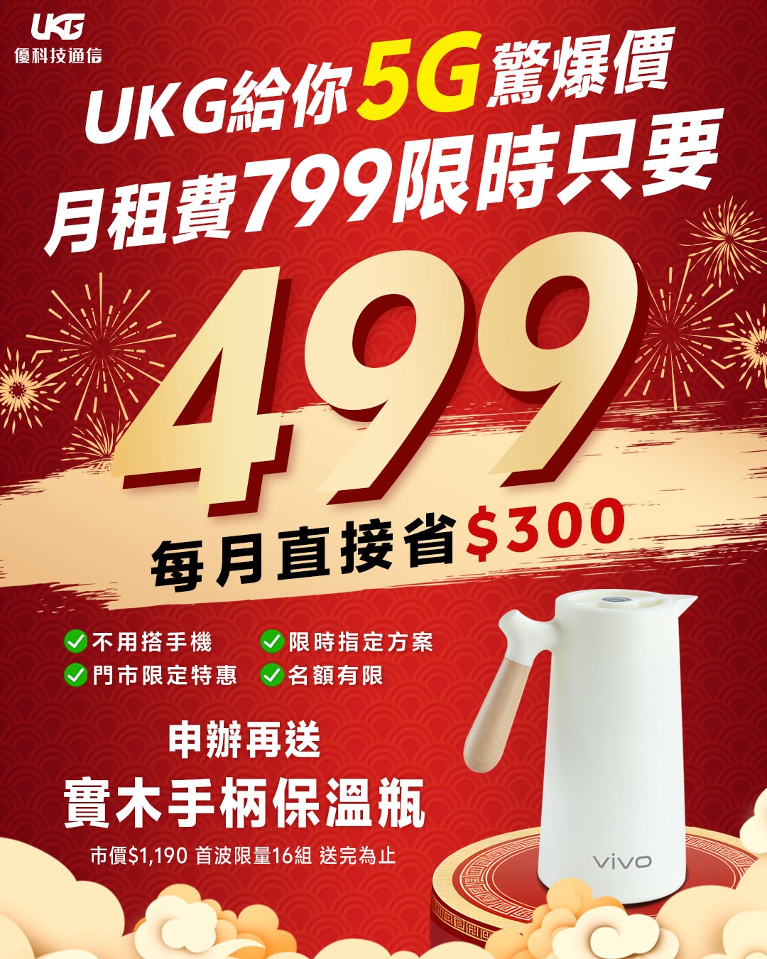 新春開運紅,月租大放送! UKG 優科技通信陪您迎接二月佳節,方案好評加碼,贈品誠意更新! 過年紅包要收好,月租更要選得巧。我們堅持給您最驚爆的價格,讓您從開春就開始「省」出一座小金庫!