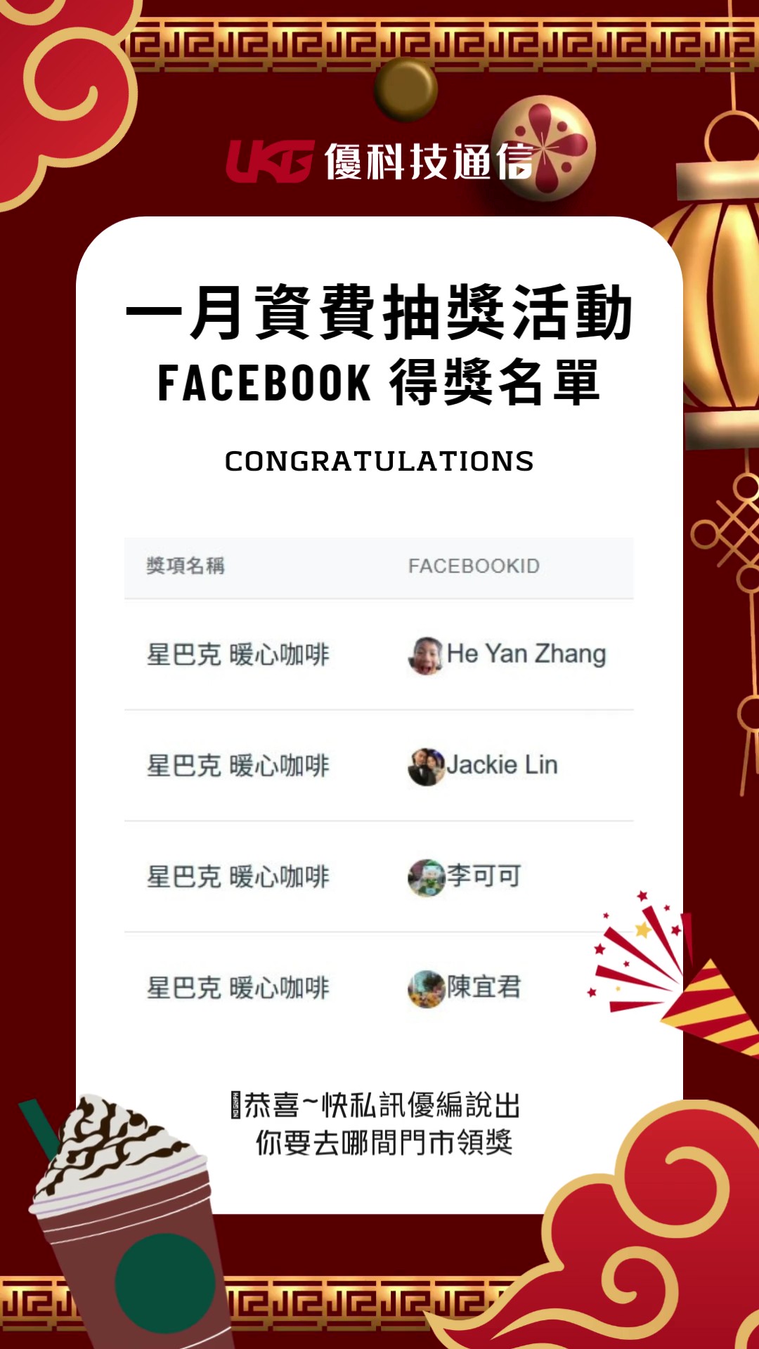 感謝大家熱情參與一月份的 Facebook 粉絲限定抽獎!看著滿滿的「UKG獨家月租費 799 限時 499」留言,感受到大家對優科技的支持與期待啦!🔥事不宜遲,立刻來公布是哪 4 位幸運兒獲得星巴克~